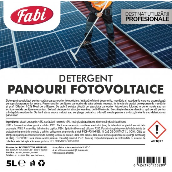 Formulat astfel încât să nu zgârie suprafețele, detergentul Fabi asigură o curățare delicată, crucială pentru a menține integritatea panourilor.